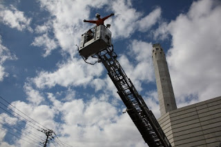 はしご車に乗る先生たち。